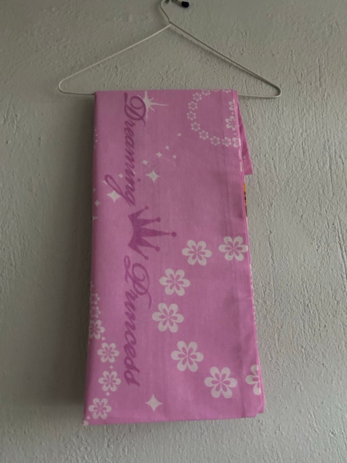 Pastel pembe renkte, baskılı çiçek desenli ve "Dreaming Princess" yazılı çocuk battaniyesi. Yumuşak sentetik kumaştan üretilmiştir.