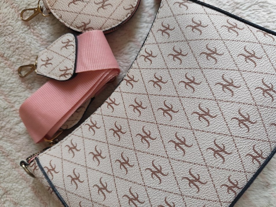Pembe baskılı cüzdanı ve kemer, cırt cırtlı kapanış ve parlak görünüme sahip, klasik tarzda.