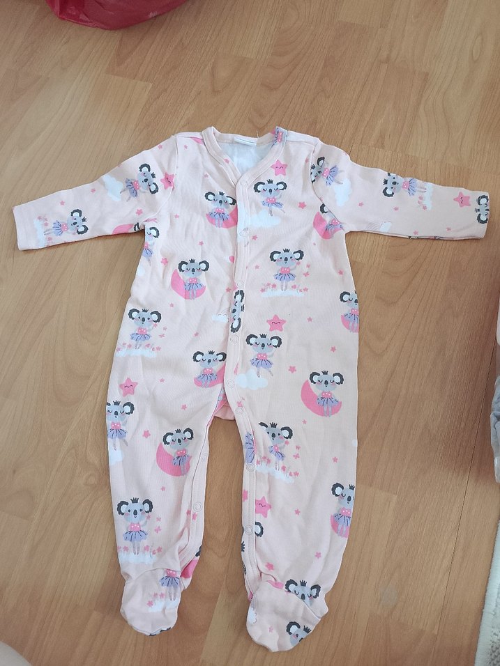 Bebe tulumu, pastel pembe renk ve baskılı desenlere sahiptir. Düğmeli ve uzun kollu, ayakları kapalıdır.