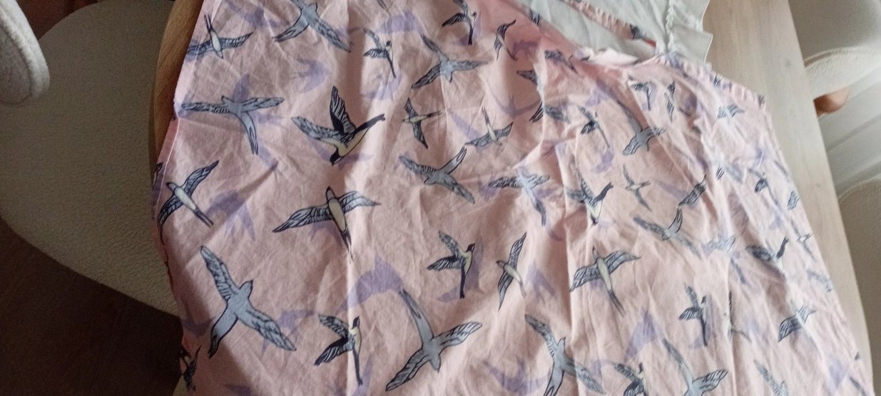 Pastel pembe renkte, kuş desenli baskılı emzirme önlüğü
