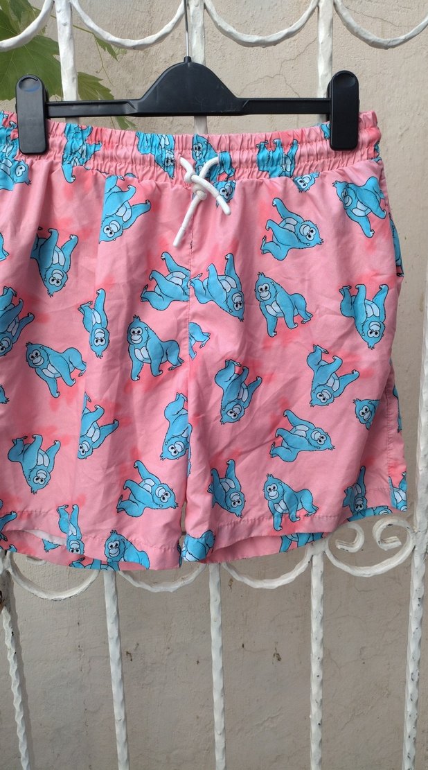 Pembe pastel renkli, mavi goril desenli, bol kesim erkek mini deniz şortu , sadece bir kez kullanıldı sorunsuz ürünler