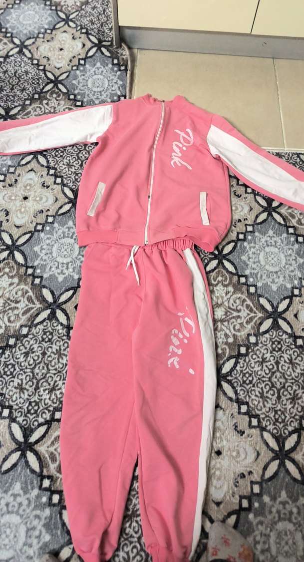 Pembe renkli, yüksek yakalı ve uzun kollu kız eşofman takımı. Baskılı detaylar, fermuarlı ceket ve yan şeritler bulunur. Rahat sokak stili.