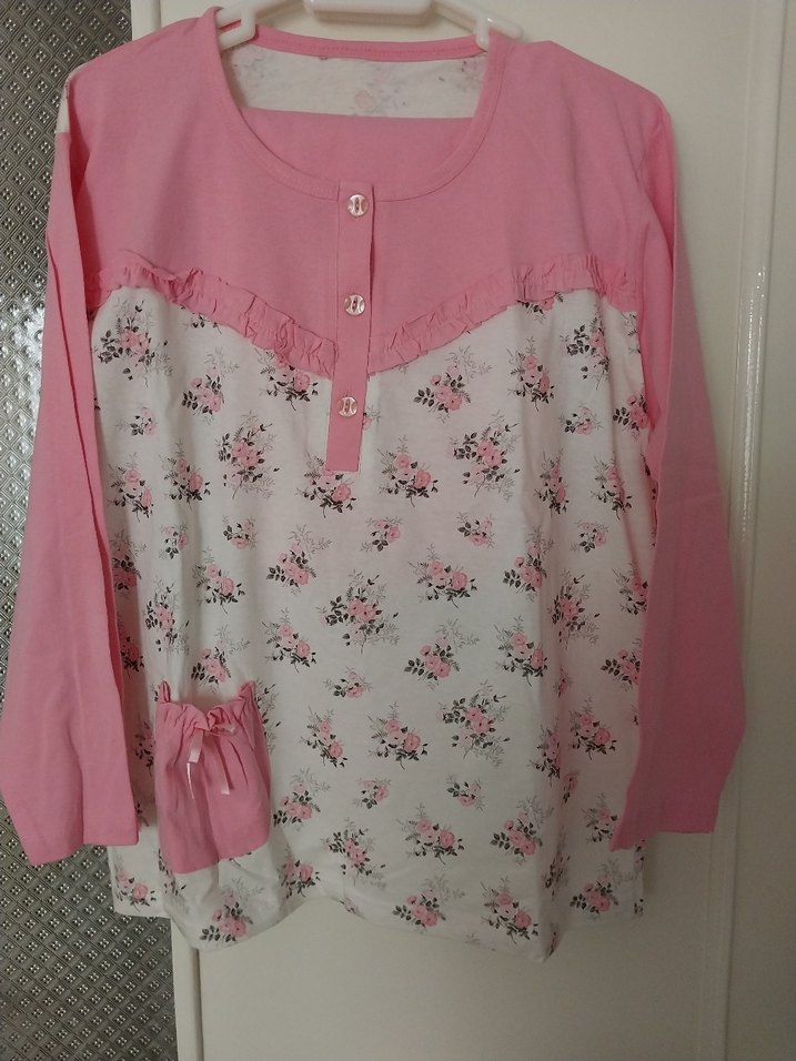 Pastel pembe renkli, uzun kollu, yuvarlak yakalı ve bol kesim gecelik. Önden düğmeli, midi boy, çiçek desenli ve küçük cepli.