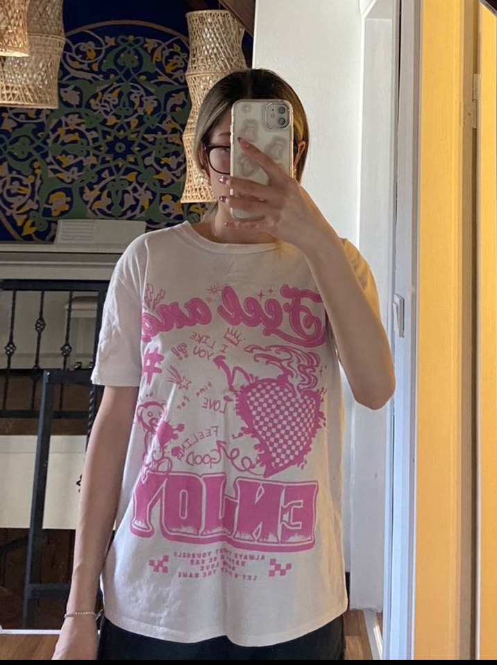 Pamuklu kumaştan, pembe baskılı, gevşek kesim kısa kollu ve bisiklet yaka kadın tişörtü. Grunge punk tarzını yansıtan günlük kullanıma uygun model.