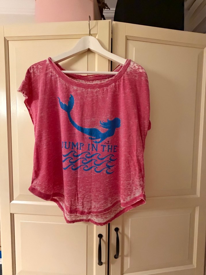 Yuvarlak yakalı, kısa kollu, gevşek kesim pembe keten hamile tişörtü. Mavi deniz kızı baskısı ve drapeli tarzı ile plaj için uygun.