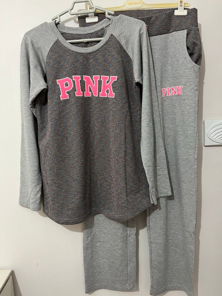 Gri yumuşak kumaştan, pembe "PINK" baskılı, uzun kollu ve bol kesim kadın pijama takımı. Normal uzunlukta üst ve cepli pantolon içerir.