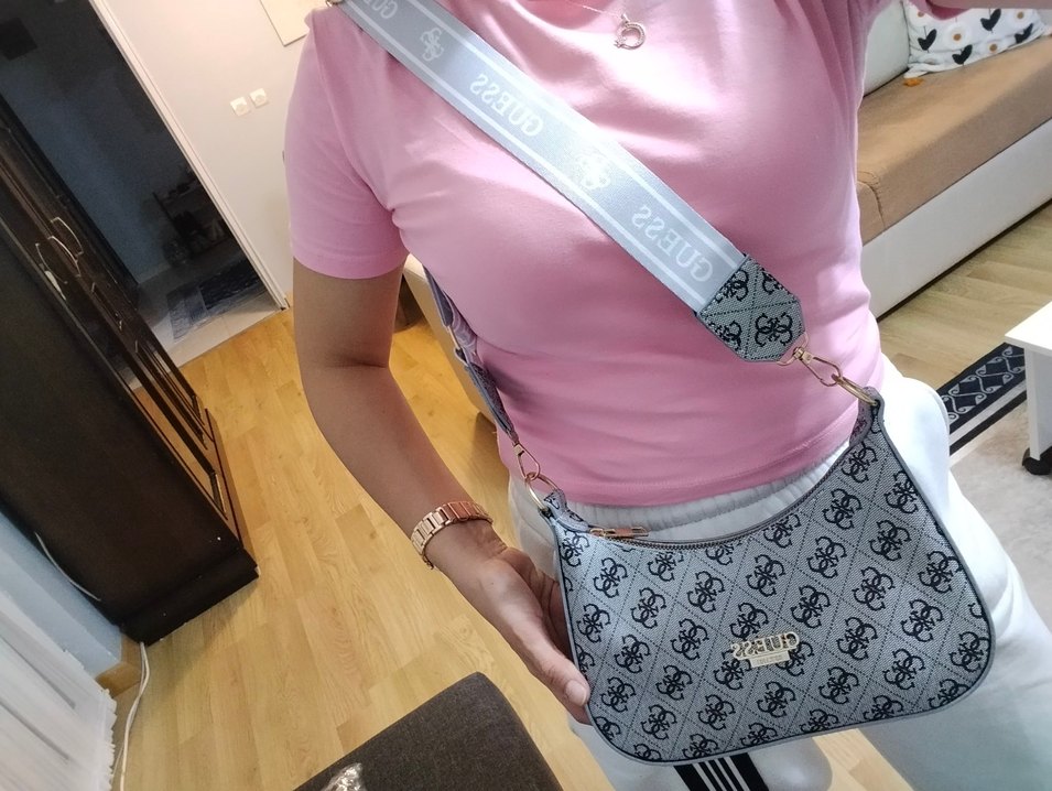 Pastel pembe baskılı omuz çantası, tokalı detaylara sahiptir. Sentetik kumaştan üretilmiş olup günlük kullanıma uygundur.