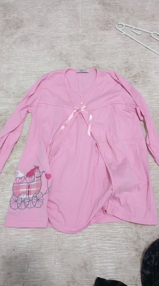 Pembe, uzun kollu, yuvarlak yakalı ve bol kesim hamile ve emzirme geceliği. Bebek arabası baskısı ve pastel tonlarıyla rahat ve kullanışlıdır.
