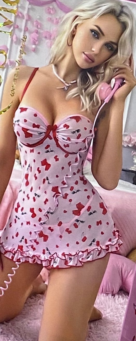 Pastel pembe renkli, ince askılı ve baskılı desenli, Paris esintili pop kültür tarzında midi boy, vücuda oturan gecelik.