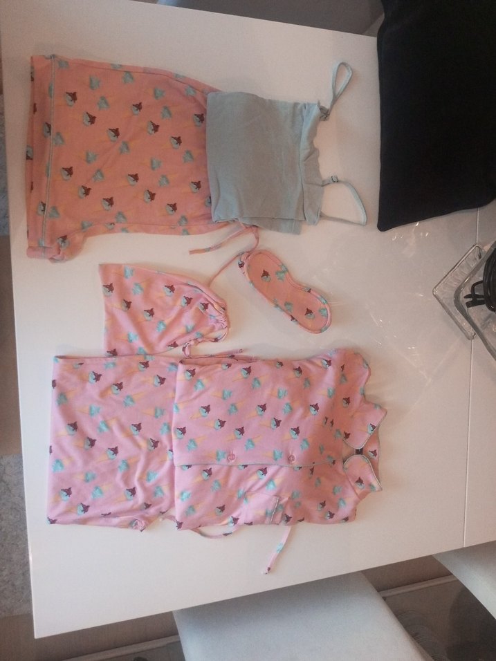 Pembe baskılı, ip askılı, bol kesim pijama takımı. Göz maskesi ve ipli çanta ile birlikte, rahatlık sunar. Yeni gibi herhangi bir deformasyon veya yırtılma yoktur. Sadece şort ve pijamanin bel lastiği dönüyor aldığımızdan beri birde üst pijamanin delikleri geniş yapılmış bilginiz olsun.Dondurma desenli
