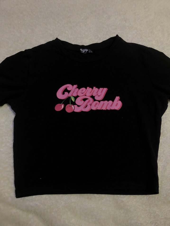 Pamuklu, kısa kollu, dar kesim tişört. Puf detaylı kolları ve pembe 'Cherry Bomb' baskısıyla romantik akşamlar için uygun.