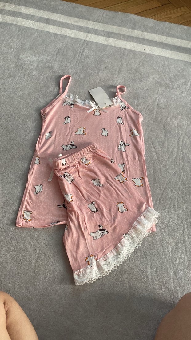 Pembe baskılı, ince askılı ve dantelli detaylı, bol kesim mini kadın pijama takımı.