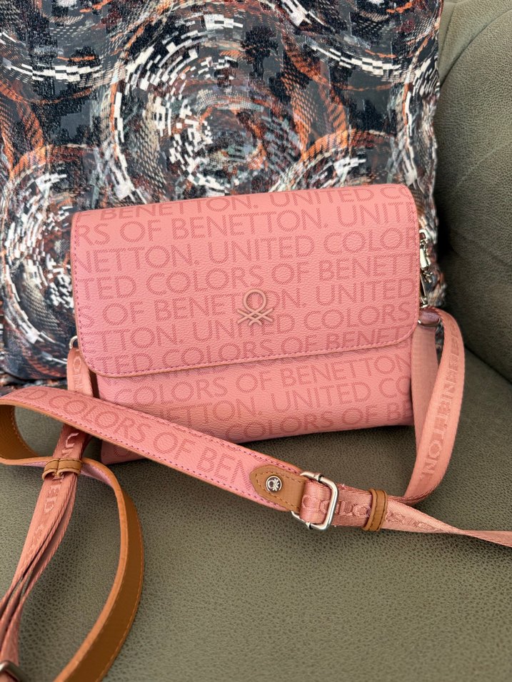 Benetton marka, baskılı desene sahip pembe pastel renk kadın bel çantası. Sentetik kumaştan, kemer detaylı ve günlük sokak stili için uygun.
