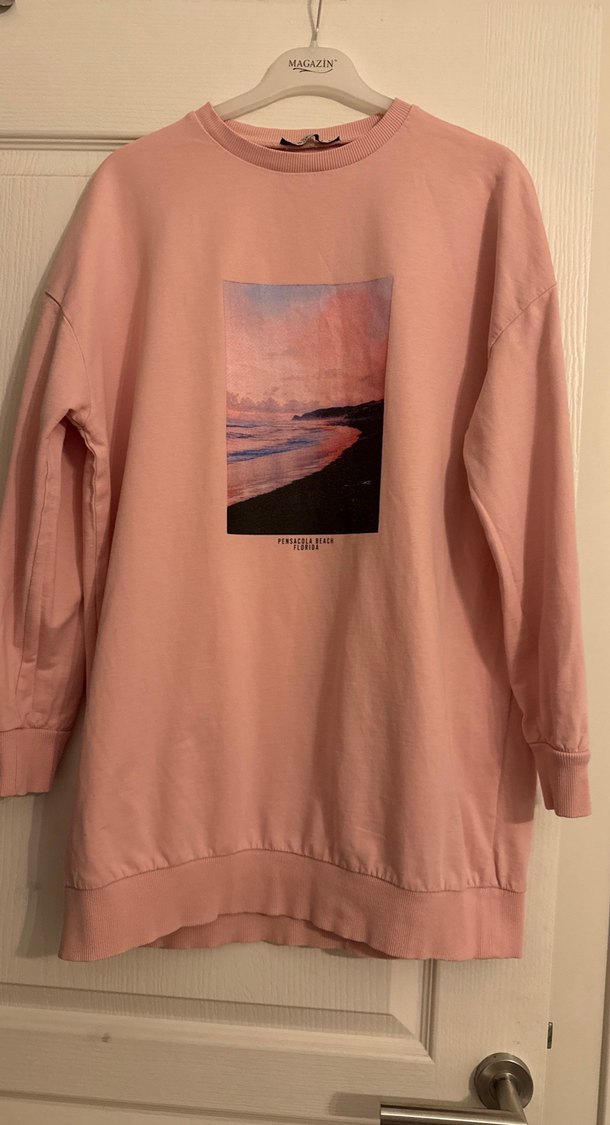 Bol kesim, uzun kollu pembe sweatshirt, bisiklet yaka ve önünde baskılı plaj manzarası. Yumuşak ve sıcak kumaştan, günlük kullanım için uygundur.