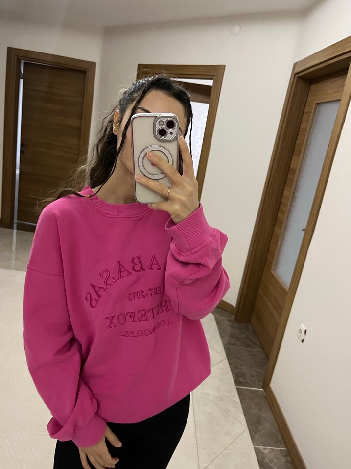 Pembe renkli, baskılı, yuvarlak yaka ve uzun kollu kadının sweatshirtü. Rahat kesimi ve yumuşak, sıcak kumaşıyla günlük kullanıma uygun şık bir parça. ✨