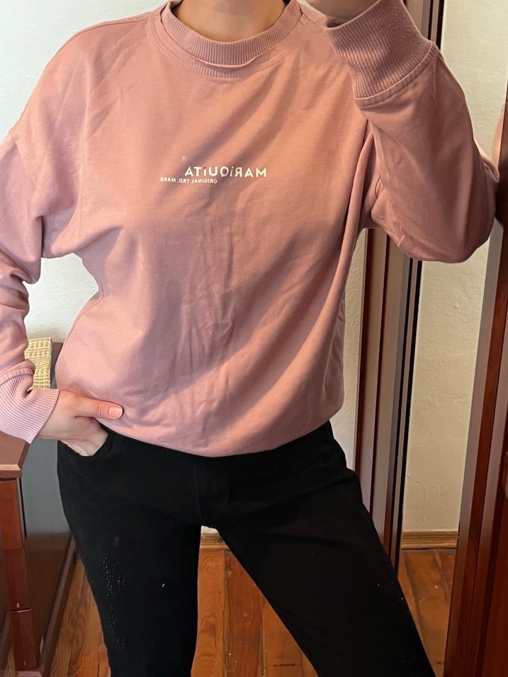 Pembe pamuklu, uzun kollu, bisiklet yaka, baskılı logo detaylı bol kesim sweatshirt. Günlük kullanıma uygun rahat tasarım.
