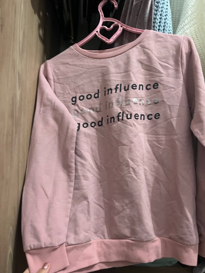 Pamuklu, uzun kollu ve yuvarlak yakalı pembe sweatshirt, rahat kesimi ve 'good influence' baskısıyla günlük kullanıma uygun.