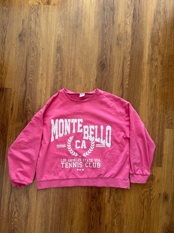Pembe, uzun kollu ve bisiklet yaka kadın sweatshirt, rahat bol kesim. Üzerinde 'MONTEBELLO CA TENNIS CLUB' baskısı vardır. Yumuşak ve sıcak kumaştan üretilmiştir. lcw.9/10 yaş .temiz kullanılmıştır .