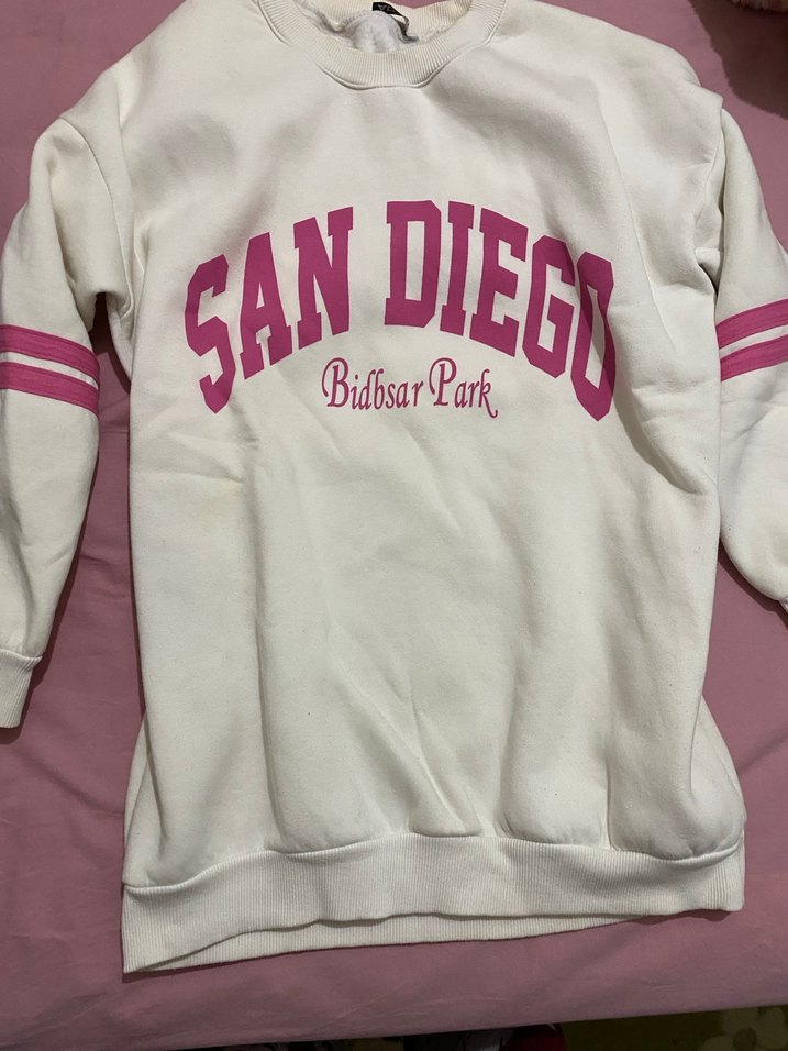 Kadınlar için uzun kollu, yuvarlak yaka ve bol kesim sweatshirt. "SAN DIEGO Bidsar Park" baskılı, yumuşak ve sıcak kumaştan. Pastel pembe detaylarla gündelik şıklık sunar.