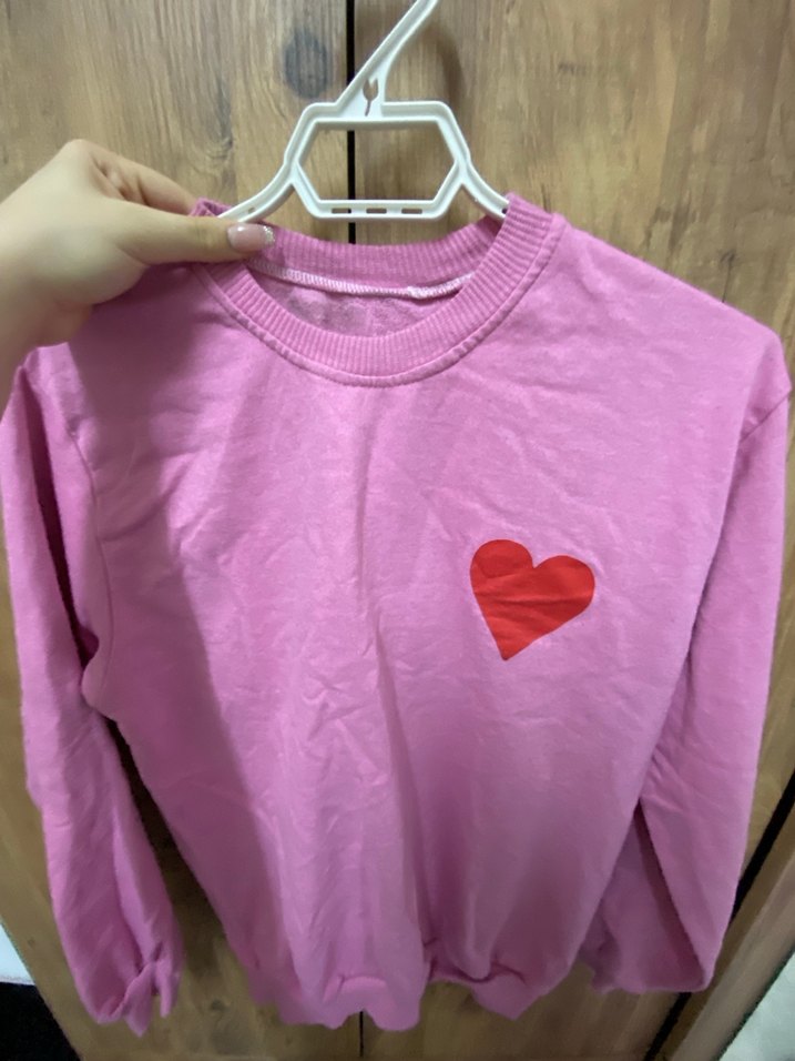 Pembe pamuklu, uzun kollu ve yuvarlak yaka kadın sweatshirtü, kırmızı kalp baskılı, rahat ve örgü dokulu, günlük kullanım için uygundur.