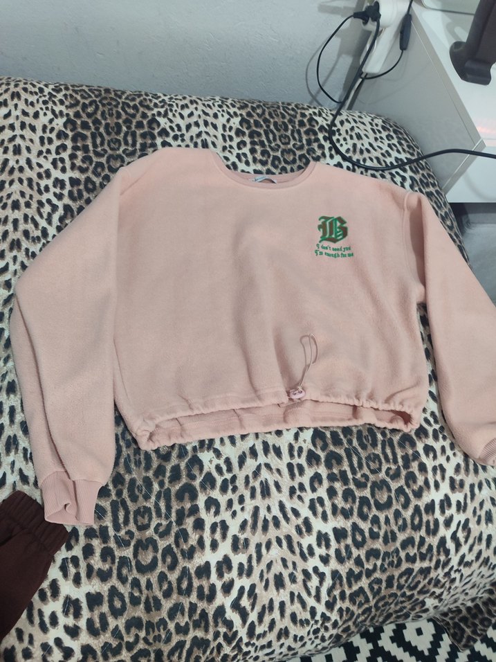 Pembe renkli, baskılı, uzun kollu, yuvarlak yaka bol kesim sweatshirt. Ayarlanabilir bel detayı ve yumuşak, sıcak kumaş kullanılmıştır.