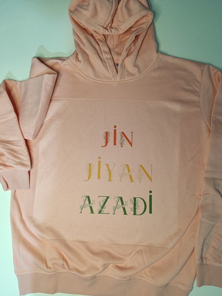 Pamuklu, pastel pembe renkli uzun kollu, kapüşonlu, kadın sweatshirt. "JIN JIYAN AZADI" baskılı, gündelik kullanıma uygun rahat ve şık bir model. S,M, L,XL, XXL,3XL bedenler mevcuttur