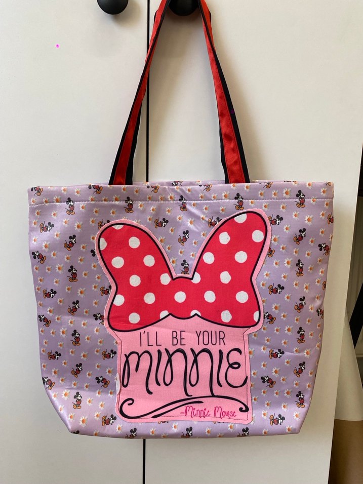 Pembe renkli, baskılı desenli kadın tote çanta. Fiyonk detaylı ve "I'll be your Minnie" yazılı, sentetik kumaştan yapılmış, bohem ve retro tarzda günlük kullanıma uygun.