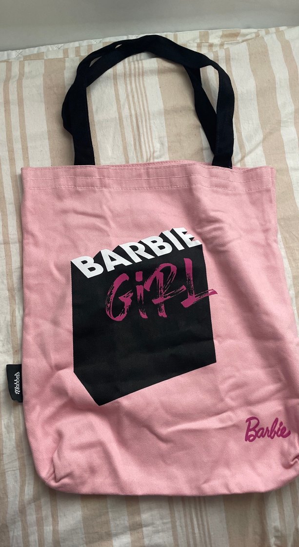 Pembe baskılı "BARBIE GIRL" deseni, tokalı detay ve siyah saplı, sentetik kumaştan yapılmış kadın tote çanta. Günlük kullanıma uygun. Orjinal üründür