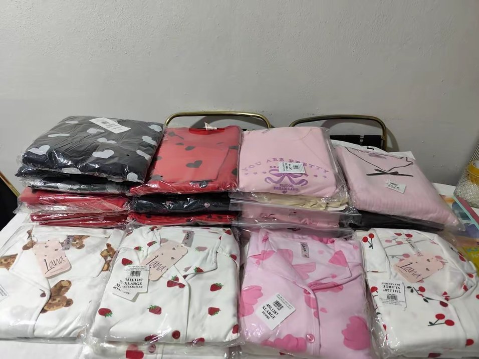 Açık pembe baskılı kadın pijama takımı, uzun kollu ve bol kesimdir. Rahat ve midi boyuyla sokak tarzına uygundur.