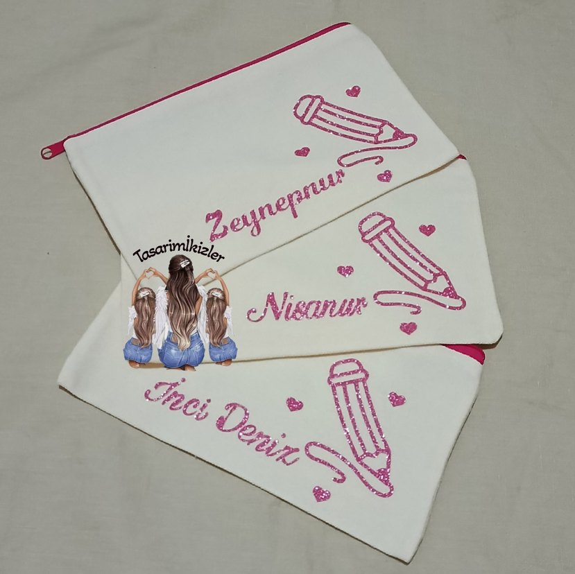 Pastel pembe renkte, baskılı kalem desenli ve isimli kız aksesuarları, sade ve klasik bir tarza sahiptir. isime özel olarak hazırlanır.