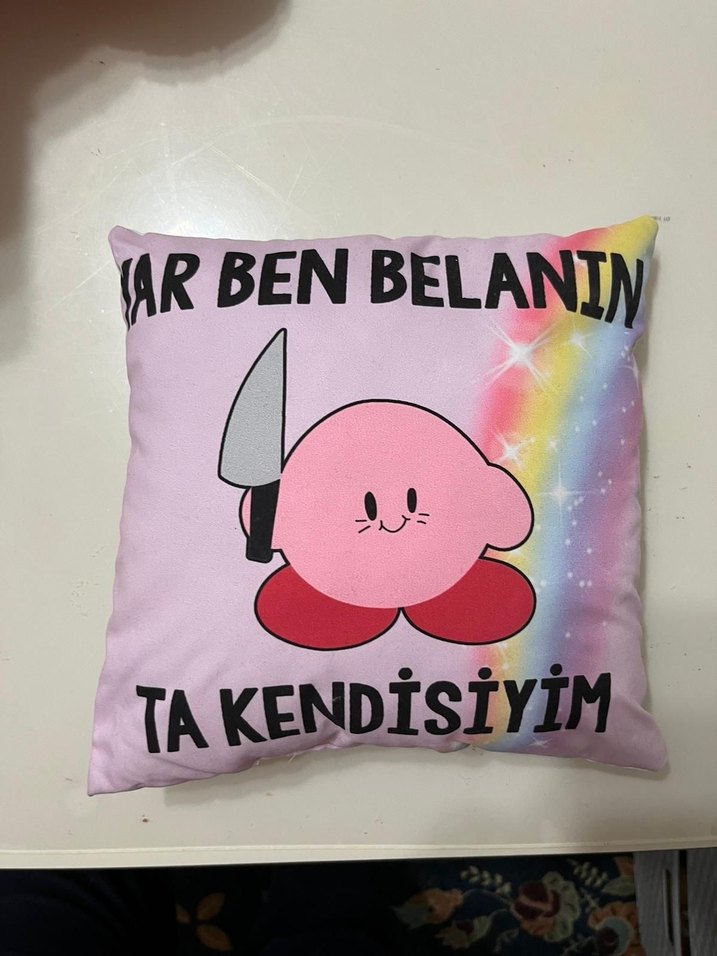 Pembe kare yastık, baskılı çizgi karakter ve pastel gökkuşağı deseniyle eğlenceli bir görünüm sunar. Sıfır ürün. 25x25