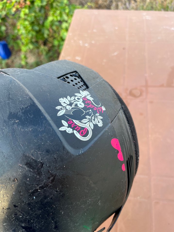 Siyah zemin üzerine pembe baskılı, kayışlı motosiklet kaskı. Plastik malzemeden üretilmiş, grunge punk tarzını yansıtıyor. ️