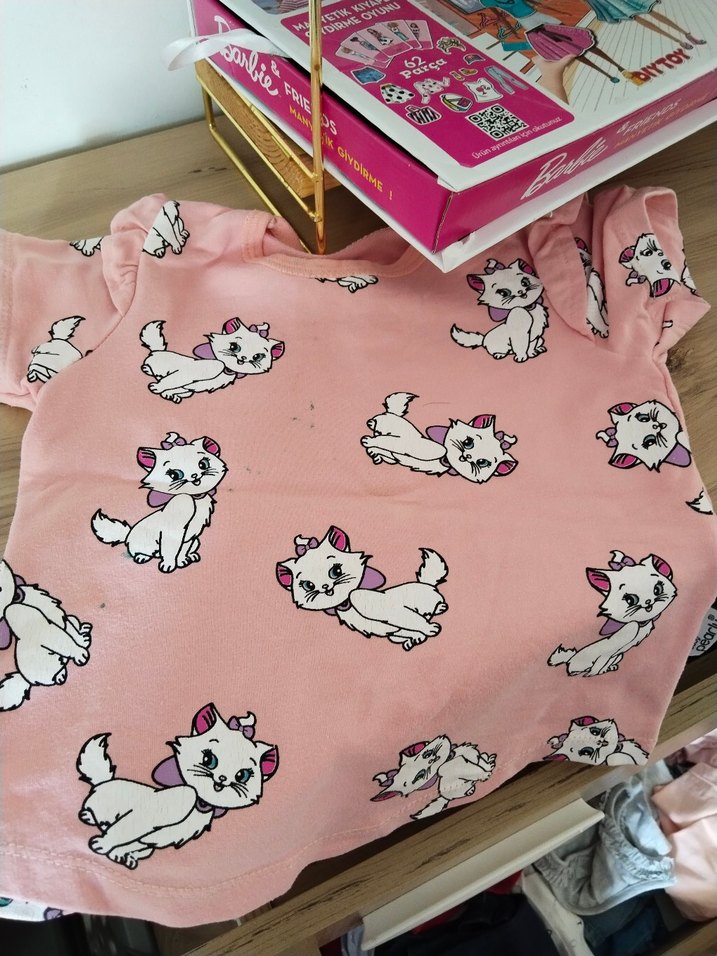 Pastel pembe renkte, baskılı sevimli kedi desenleriyle sokak stili kedi kıyafeti. Yumuşak kumaştan yapılmıştır.
