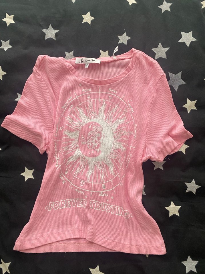 Pembe, baskılı, kısa kollu, bohem ve retro tarzı yansıtan, fitted kesim ve yuvarlak yakalı tişört.