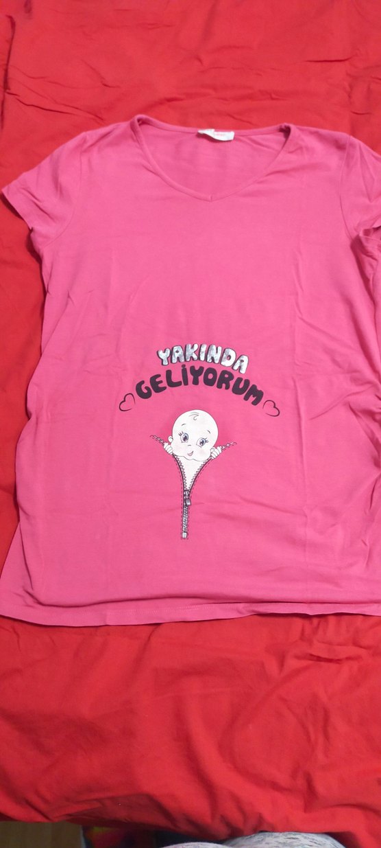 Pamuklu, kısa kollu, yuvarlak yaka, düğmeli ve baskılı pembe hamile bluzu. Rahat ve şık, günlük kullanıma uygun.