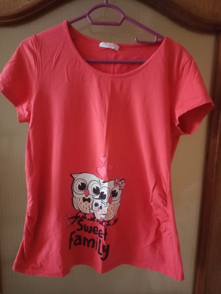 Pembe, kısa kollu, yuvarlak yakalı, bol kesim hamile bluzu. Renkli baykuş ailesi baskısı ve "Sweet Family" yazısı bulunur. Rahat sentetik kumaştan, evde kullanım için uygun.
