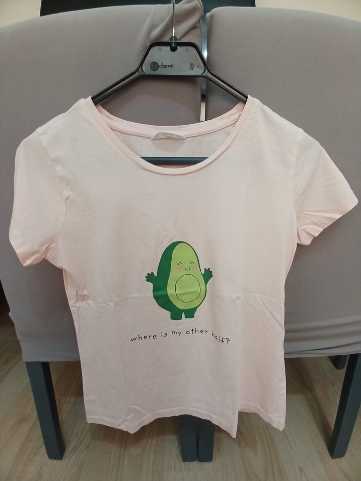Pembe renkli, kısa kollu ve yuvarlak yakalı hamile tişörtü. Pamuklu kumaştan, bol kesim ve baskılı sevimli avokado deseni 'where is my other half?' yazısıyla. Rahat ve günlük kullanım için uygun.