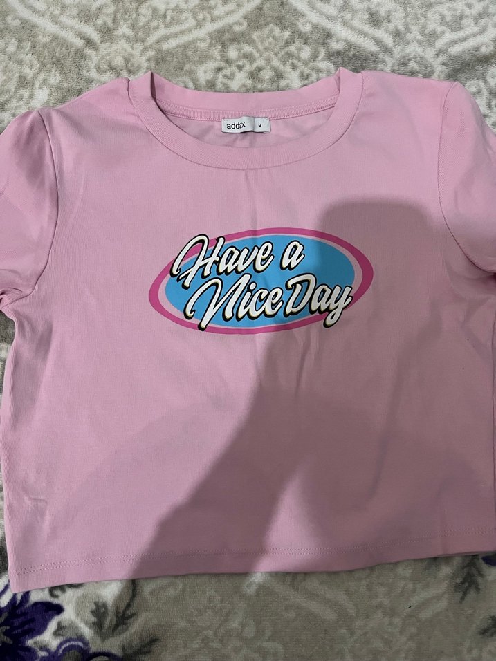 Crop Pamuklu, kısa kollu, bisiklet yaka ve vücuda oturan kesime sahip pembe tişört. Önünde 'Have a Nice Day' baskısı bulunur, günlük sokak stili için uygundur.