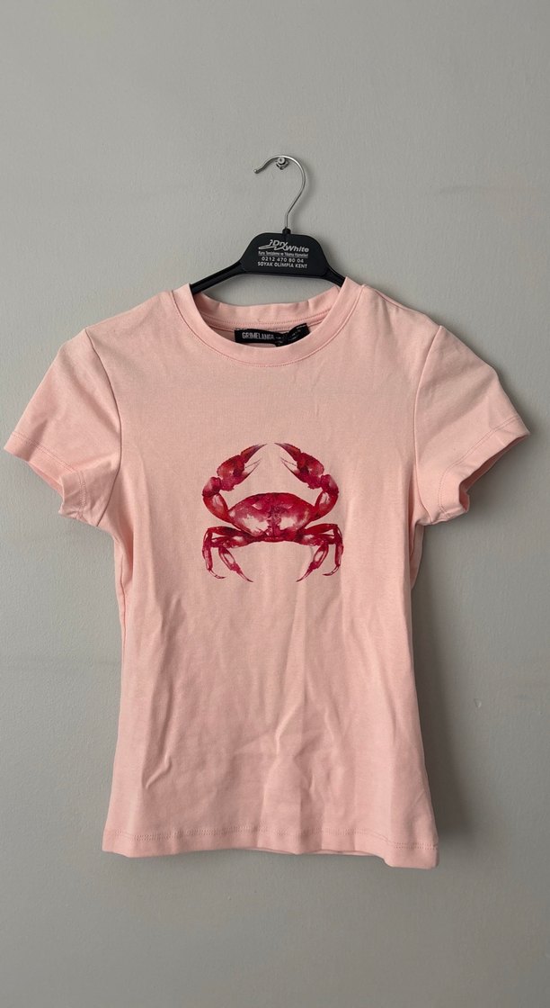 Dar kesim, kısa kollu kadın tişörtü, yuvarlak yaka ve yumuşak sentetik kumaştan, pastel pembe renkte, üzerinde yengeç baskısı bulunur. Hiç giyilmedi, etiketi üzerindedir. Rengini kendime yakıştırmadığımdan satıyorum.