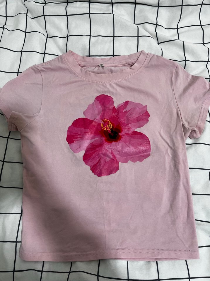 Bu kadın tişörtü, pastel pembe renginde ve önünde büyük çiçek baskısı ile fitted kesime sahiptir. Kısa kollu ve yuvarlak yakalı, yumuşak sentetik kumaştan üretilmiştir.