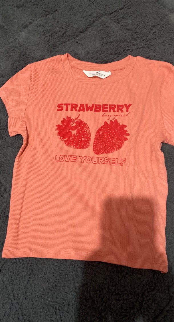 Pembe baskılı, kısa kollu ve dar kesim kadın tişörtü. Sentetik yumuşak kumaştan, önünde 'STRAWBERRY' ve 'LOVE YOURSELF' yazılı çilek baskısı bulunur.