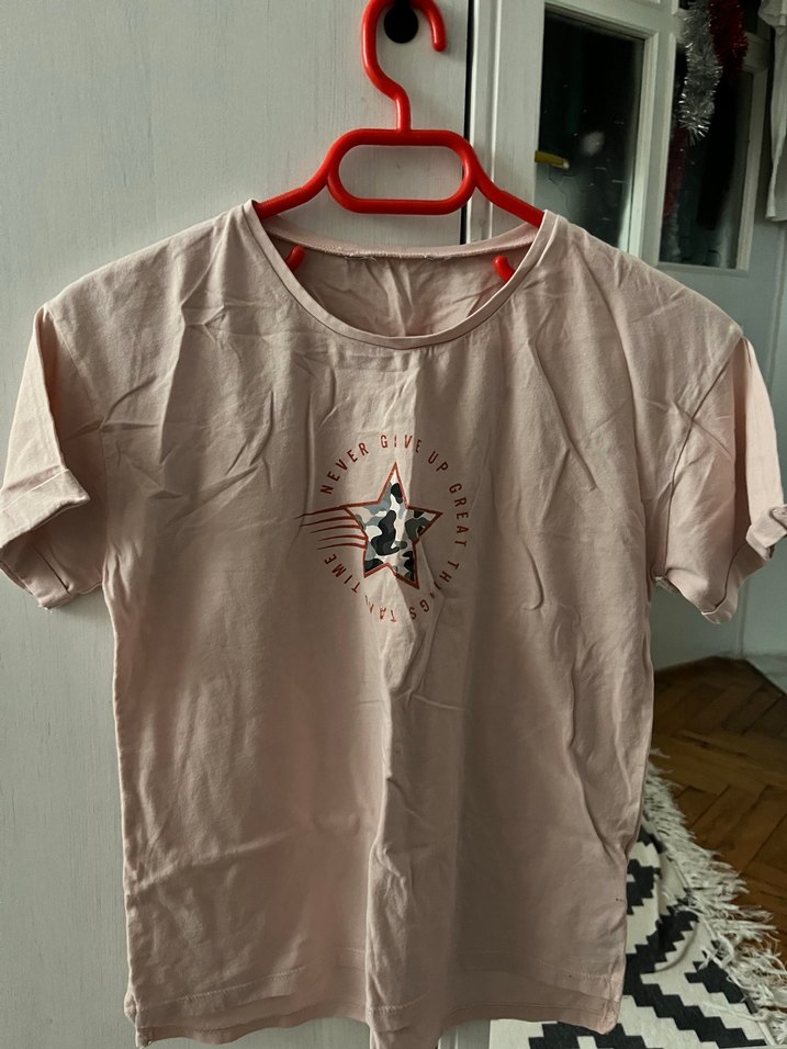 Pamuk kumaştan yapılmış, kısa kollu, yuvarlak yakalı, bol kesim pembe kadın tişörtü. Üzerinde baskılı yıldız deseni bulunur, günlük kullanıma uygundur. Temiz üründür. Birkaç kez kullanıldı.