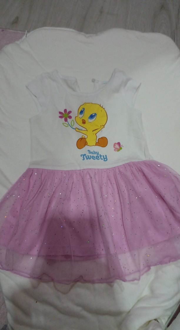 Kolsuz, fitted yapıda, crew neck yakalı kız çocuk elbisesi. Üst kısmında Tweety baskısı, pastel pembemsi, simli, fırfırlı etek detayı bulunur.