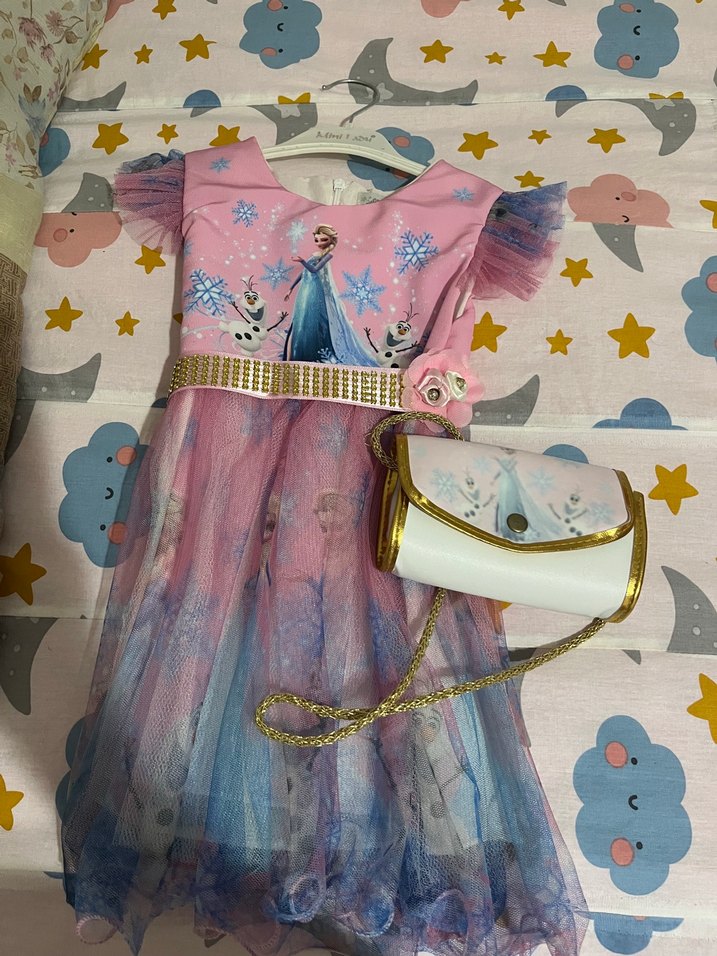 Pembe baskılı, sim detaylı kız çocuk elbisesi. İnce askılı, straplez yaka ve kat kat yumuşak etekli. Çiçek aksesuarı ve küçük çanta ile tamamlanır. Hiç kullanılmadı çantası dahil 2 yaş için uygun marka temsilidir