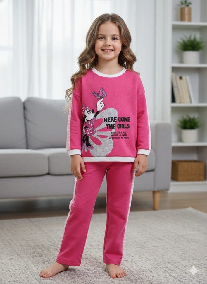 Pembe renkli, uzun kollu ve yuvarlak yaka, bol kesim kız çocuk eşofman takımı. Renkli baskı ve cırt cırt detaylı, rahat ve gündelik tarzda. % 100 pamuk. 2.3.4.5 yaşları var