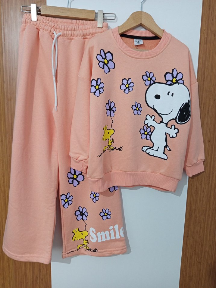 Pembe pastel tonlarında, pamuklu kumaştan, bol kesim kız çocuk sweatshirt ve eşofman altı takımı. Uzun kollu, bisiklet yaka, çiçek ve Snoopy baskılı, üzerinde "Smile" yazısı bulunan örme dokulu rahat bir model. 9/10 yaş