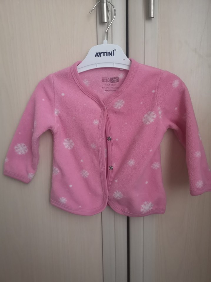 Pembe baskılı, uzun kollu, düğmeli kız çocuk polar hırka. Pastel tonlarda yumuşak dokulu kumaş.