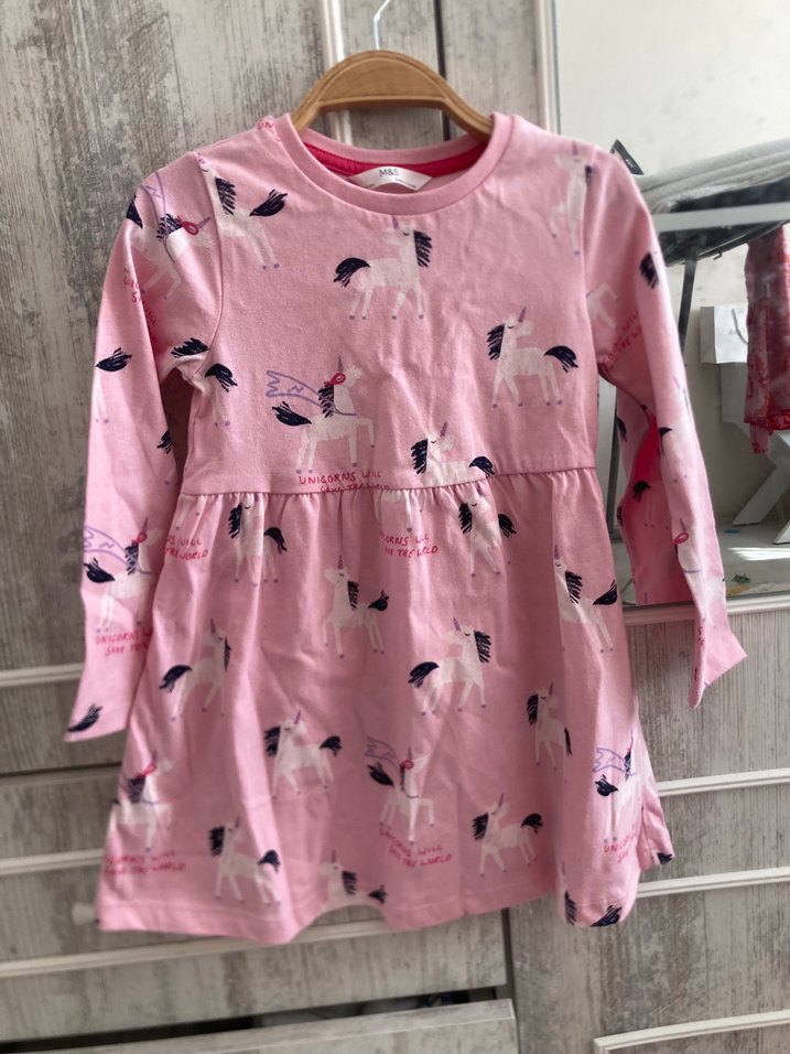 Pembe renkli, uzun kollu kız çocuk elbisesi; yuvarlak yaka ve fırfır detaylıdır. Yumuşak ve sıcak kumaştan üretilmiş, baskılı tek boynuzlu at desenine sahiptir.