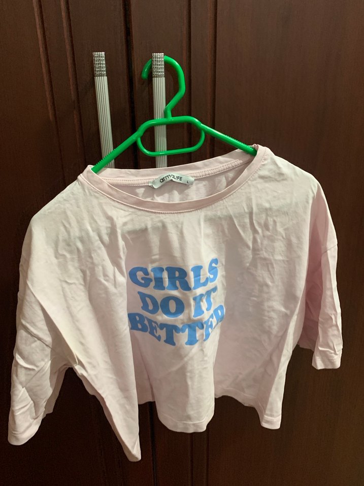 Pamuk kumaştan, gevşek kesim ve uzun kollu, yuvarlak yakalı pembe tişört. Mavi baskılı "GIRLS" yazısı bulunur. Günlük sokak stili için uygun.
