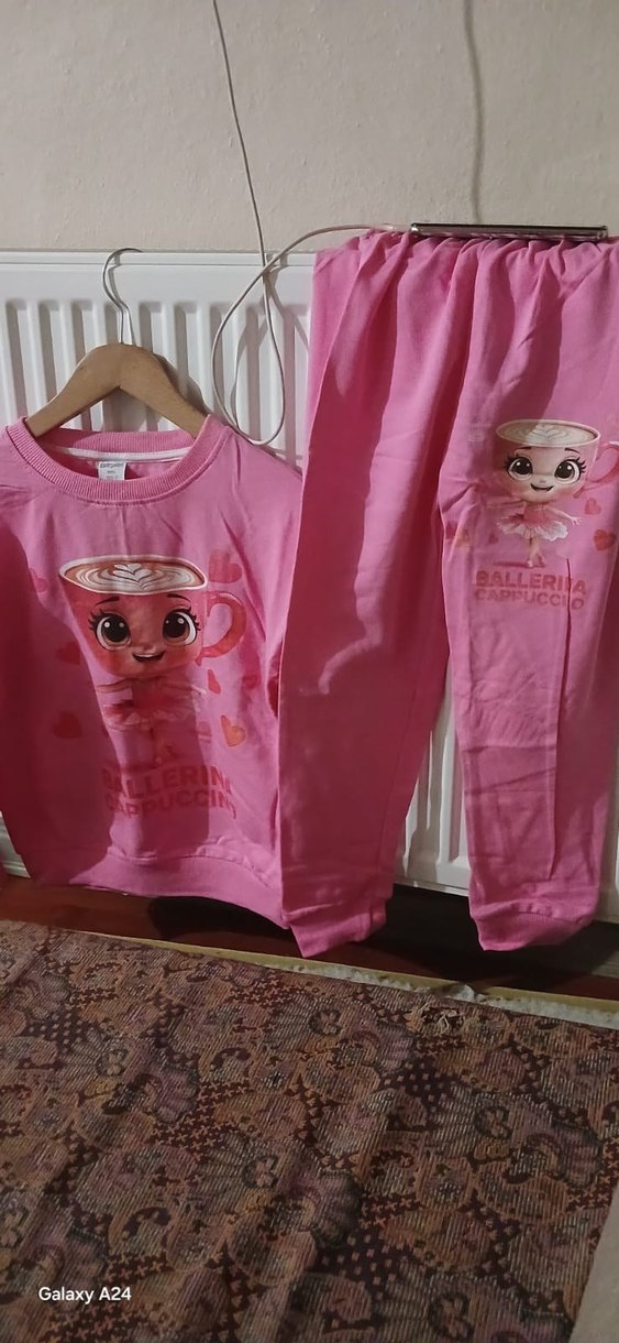Pastel pembe renkli, bol kesim kız eşofman takımıdır. Uzun kollu, bisiklet yaka ve yumuşak fleece kumaşlıdır. Örgü detaylı ve ballerina cappuccino baskılıdır.